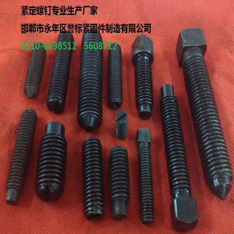 固定機(jī)件相對位置用的一種螺釘。使用時,把緊定螺釘旋入待固定的機(jī)件的螺孔中,以螺釘?shù)哪┒司o壓在另一機(jī)件的表面上,即使前一機(jī)件固定在后一機(jī)件上。開槽和內(nèi)六角緊定螺釘用于釘頭不允許外露的機(jī)件上,方頭緊定螺釘適用于釘頭允許外露的機(jī)件上。螺釘?shù)膲壕o力以開槽螺釘小,方頭螺釘大,內(nèi)六角螺釘居中。錐端螺釘適用于強(qiáng)度小的機(jī)件上;無尖錐端螺釘適用于壓緊面上制有凹坑的機(jī)件上,以增加傳遞載荷的能力;平端螺釘(壓緊面應(yīng)是平面)和凹端螺釘,均適用于硬度較大或經(jīng)常調(diào)整位置的機(jī)件上;長圓柱端螺釘適用于管形軸(薄壁件上,圓柱端進(jìn)入管形軸的孔眼中,以傳遞較大的載荷,但使用時應(yīng)有防止螺釘松脫的裝置。